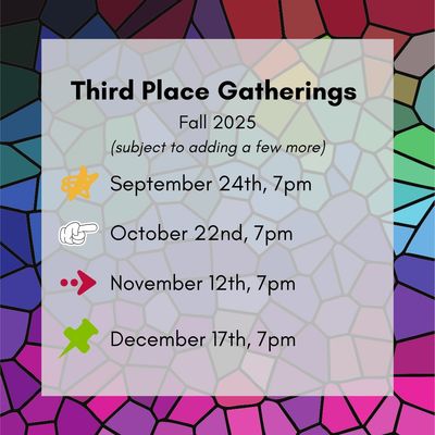 This Fall, we will be offering Third Place gatherings facilitated by Mother Suz once a month. There may be additional dates added with other events, but stay tuned for those!